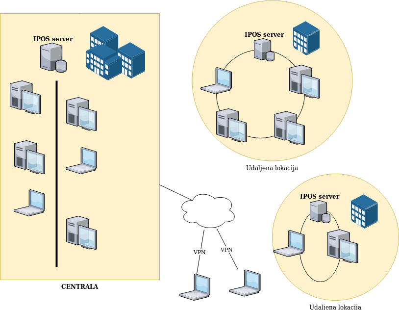 Za komunikaciju sa udaljenim radnim jedinicama posedujemo specijalno razvijen sistem za sinhronizaciju podataka koja se može obavljati po potrebi. Direktna veza radnih stanica sa IPOS-om se može izvršiti postavljanjem VPN tunela
