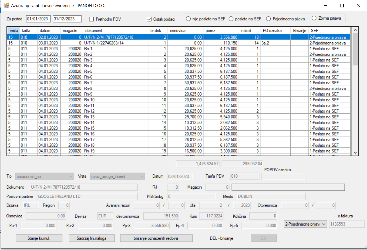 A u pregledu vanbilanske evidencije za svaki dokument možete videti da li je poslat na SEF i u koju evidenciju je poslat.