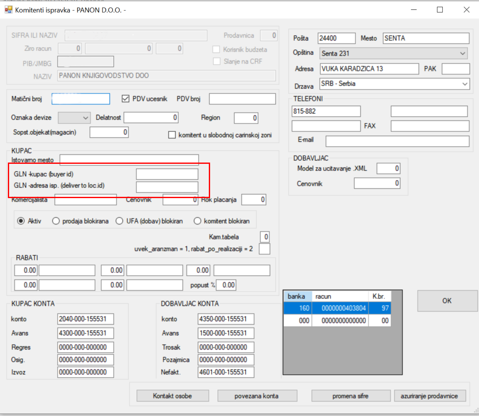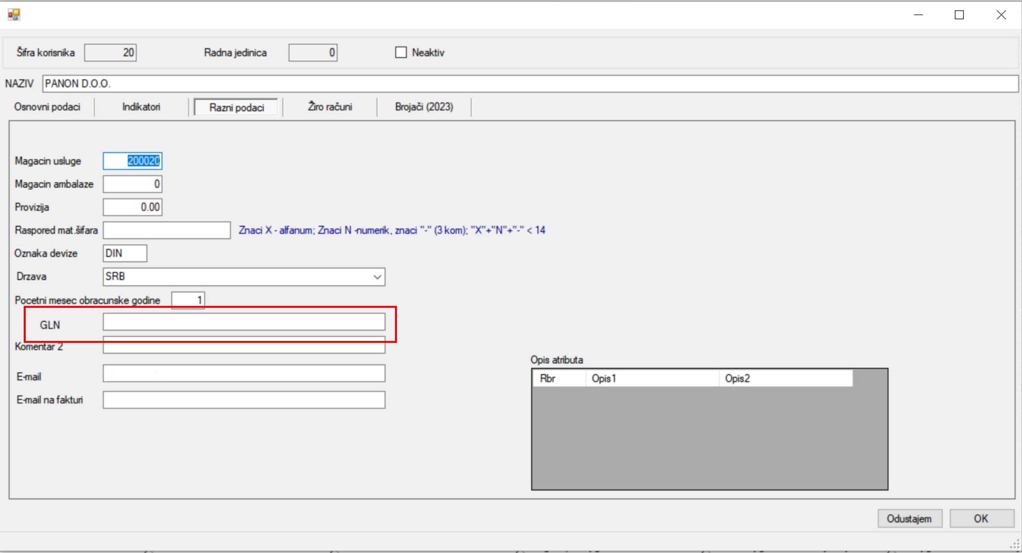 Unos GLN polja za elektronsku fakturu
